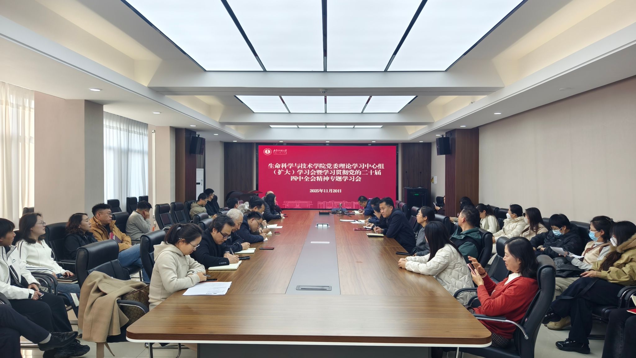 为深入学习贯彻党的二十届四中全会精神,11月20日下午,学院在生物楼三楼会议室召开党委理论学习中心组(扩大)学习会暨学习贯彻党的二十届四中全会精神专题学习会。学院全体教师参加会议。
