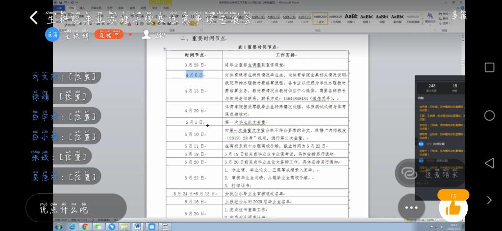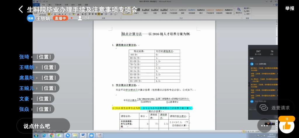 3月31日上午10:00,437必赢会员中心网页版通过钉钉网络视频(生科院毕业就业创业指导大讲堂)召开了2020届毕业生毕业手续及注意事项专项会议。会议由2020届本科毕业生毕业审核工作领导小组组长、学院分管教学副院长王铁娟老师主持,2020届毕业生、毕业班班主任及团学、教务等相关工作人员共272人参加会议。