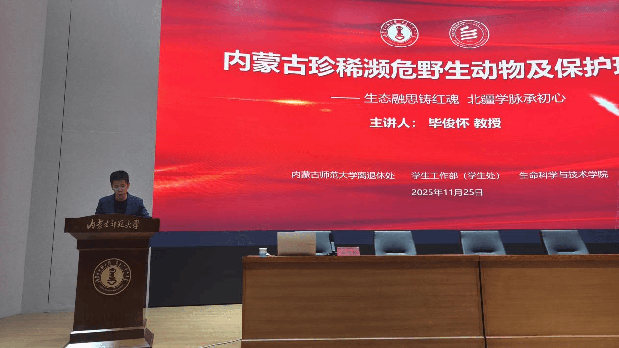 为扎实推进党建与育人工作深度融合,营造良好的学风氛围,2025年11月25日,437必赢会员中心网页版学生工作部(学生工作处)、离退休教职工工作处联合主办,必赢国际437官网承办的离退休教授宣讲活动在赛罕校区信息楼学术报告厅举行。本次活动以"生态融思铸红魂,北疆学脉承初心"为主题,邀请毕俊怀教授做了题为《内蒙古珍稀濒危有蹄类动物资源现状与保护》的专题讲座。